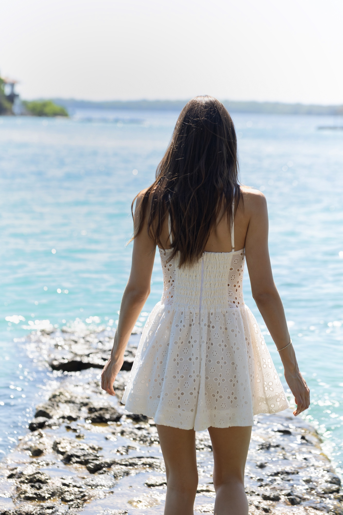 The Mila is the kind of summer crush you never get over. Crafted in romantic eyelet, this mini dress blends a playful silhouette with an effortless femininity that feels as light as a sea breeze. The gathered bust with a front tie subtly highlights your figure, while the flared skirt adds irresistible movement with every step.